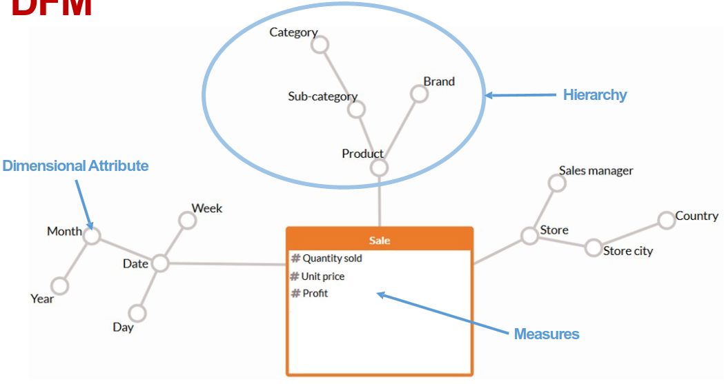 | hierarchy | directed tree with dimensional attributes as nodes, it includes a dimension at the root of the tree |