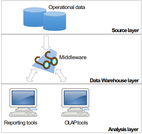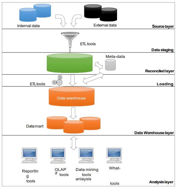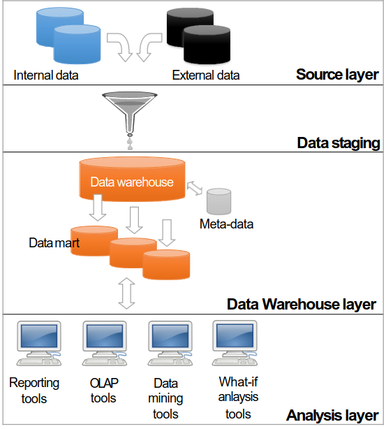 - in this architecture data are extracted from source layers trough ETL and are inserted in a data warehouse layer where they are stored and accessed by the analysis layer