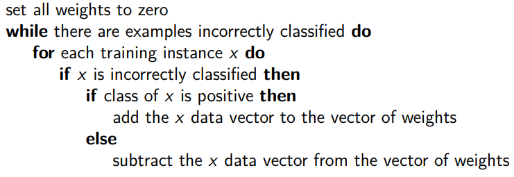 Ogni modifica dei pesi sposta il piano verso individui mal classificati, se l’algoritmo è classificato male e dovrebbe essere positivo aggiungo ai pesi del percettrone il valore dei suoi attributi se è negativo sottraggo. L’algoritmo termina solo de il dataset è linearmente Separabile quindi è bene impostare un limite temporale ammettendo errori.