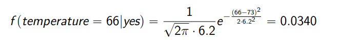 Nel caso di valori numerici non si può usare il metodo basato sulle frequenze. Assumiamo che i valori si trovino su una distribuzione Gaussiana, descriviamo la distribuzione del valore degli attributi sulla base del valor medio e della varianza degli attributi all’interno di ogni classe. La distribuzione di valore per un atributo di una classe è :