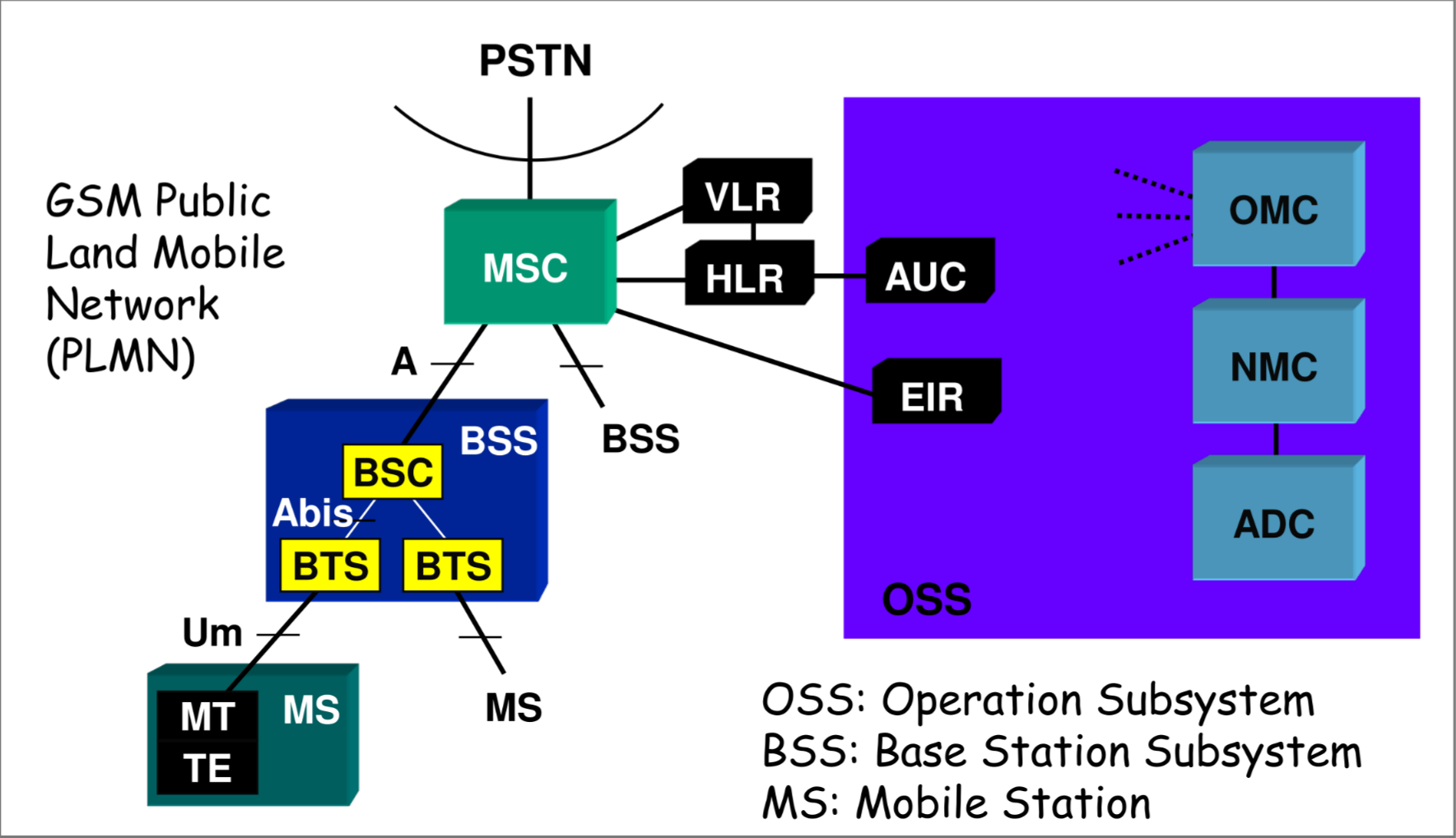 - the OSS components offers services of authentication of the nodes through AUC and the identification of fraudulent identities with the EIR, it also offers network monitoring control and management through the OMC NMC ADC