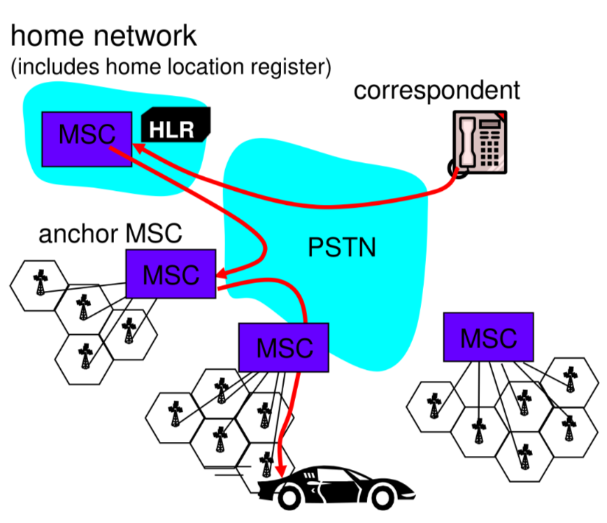 - MSC plays the role of gateway towards the PSTN network, the call routing is done trough the use of the VLR HLR registries